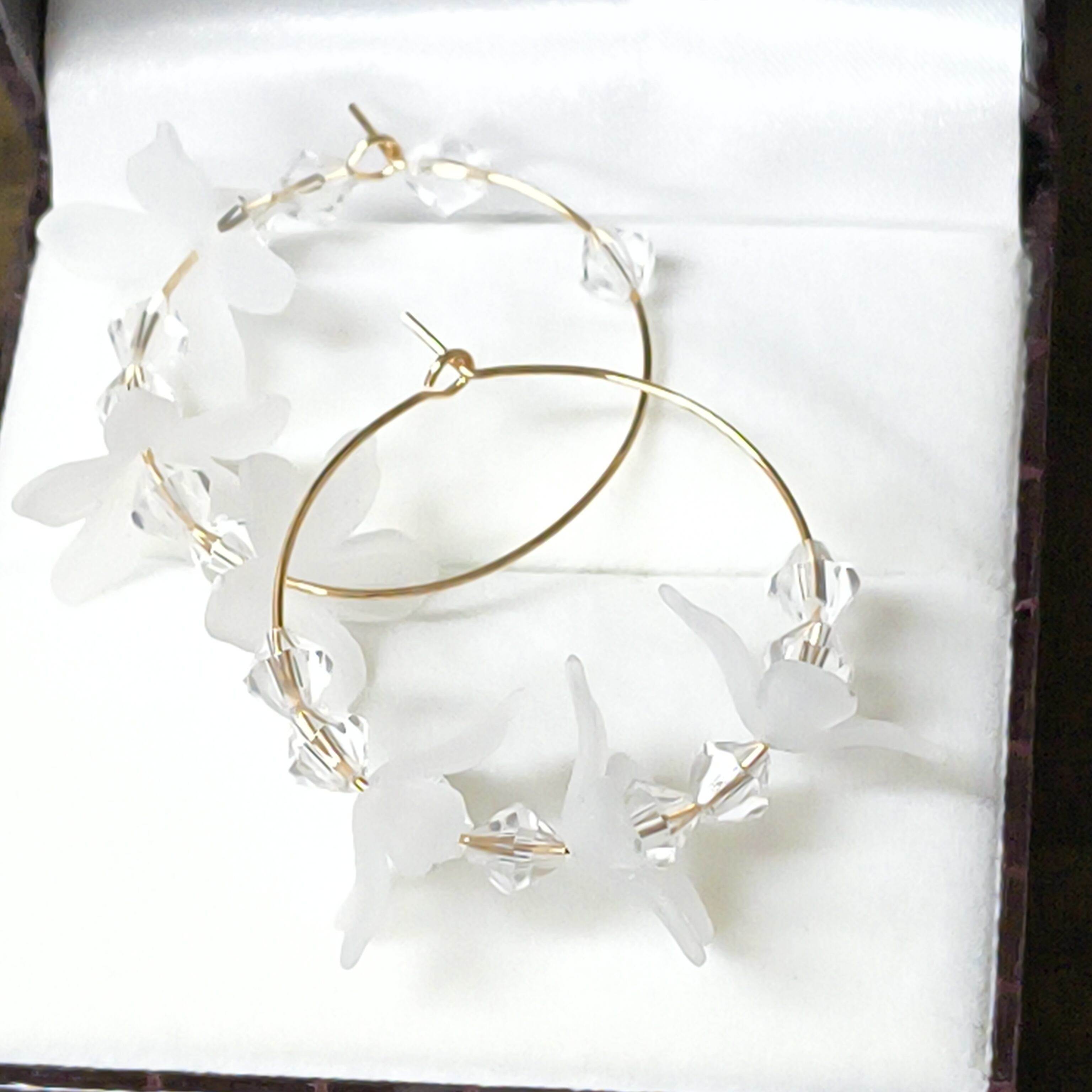 フープピアス お花 花 フラワー フラワーモチーフ ハンドメイド ゴールド 白 ホワイト 半透明 大ぶり パーティ イベント 存在感 上品 エレガント | Turning(ターニング)公式・オンラインショップ